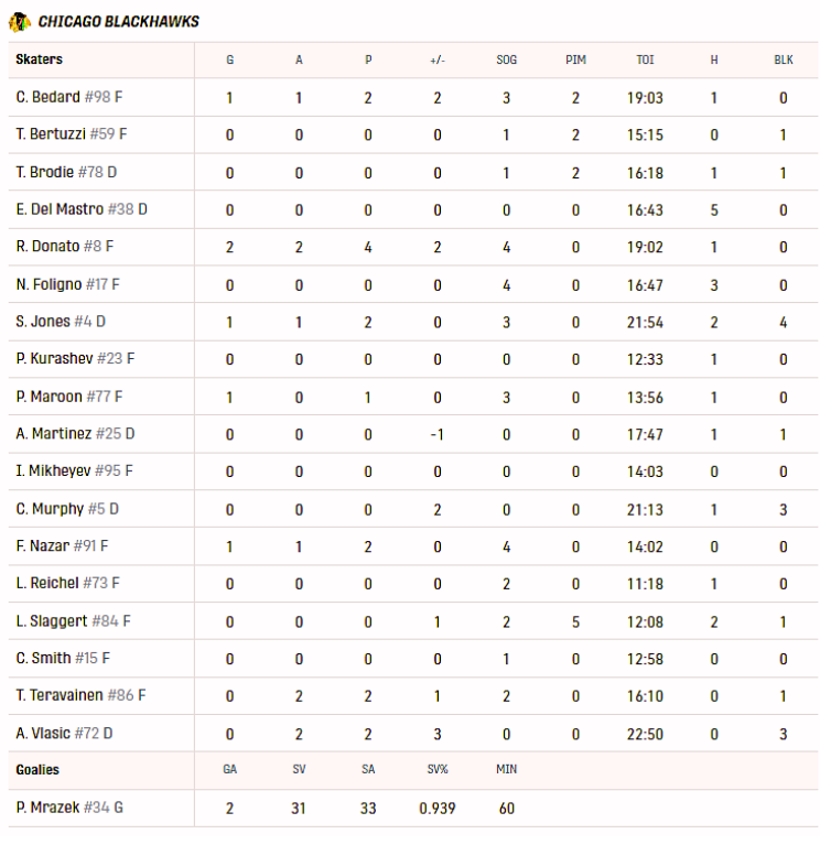 W meczu rozegranym dzisiejszej nocy w United Center, Chicago Blackhawks wygrali z Nashville Predators 6:2 (2:1, 3:0, 1:1). Bramki dla gospodarzy strzelili: Frank Nazar (Alex Vlasic, Teuvo Teravainen), Pat Maroon (bez asysty), Connor Bedard (Ryan Donato, Seth Jones), Ryan Donato (Teuvo Teravainen, Frank Nazar), Seth Jones (Ryan Donato, Connor Bedard) oraz ponownie Ryan Donato (Alex Vlasic). Bramki dla gości strzelili: Colton Sissons (Cole Smith) oraz Tommy Novak (bez asysty).