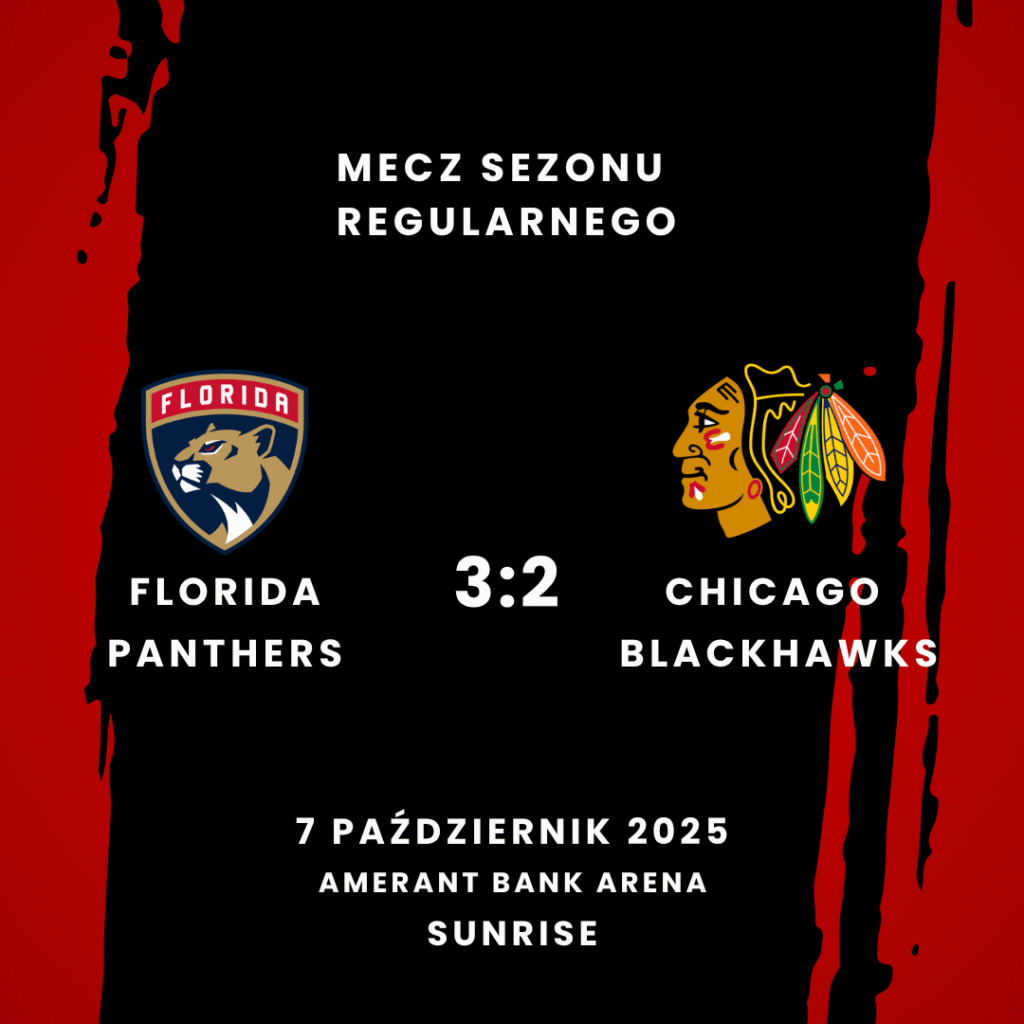 W meczu rozegranym minionej nocy w Amerant Bank Arena, Chicago Blackhawks przegrali z Florida Panthers 2:3 (1:2, 1:0, 0:1). Bramki dla gospodarzy strzelili: A.J. Greer (Jonah Gadjovich, Gustav Forsling), Carter Verhaeghe (Mackie Samoskevich – w przewadze) oraz Jesper Boqvist (Mackie Samoskevich, Evan Rodrigues). Bramki dla gości strzelili: Frank Nazar (Tyler Bertuzzi, Teuvo Teravainen) oraz Teuvo Teravainen (Frank Nazar, Tyler Bertuzzi).
