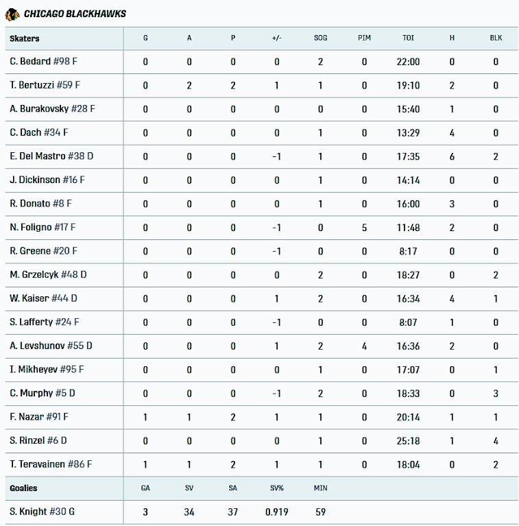 Druga formacja ataku Blackhawks – Teuvo Teravainen, Frank Nazar i Tyler Bertuzzi – maczała palce w obu golach drużyny. Nazar otworzył wynik przepięknym golem po samotnym wyjściu w pierwszej tercji, natomiast Teravainen wykorzystał sytuację 2 na 1 w drugiej tercji, wyrównując na 2:2. Cała trójka napastników zdobyła po dwa punkty i była najlepszymi zawodnikami na lodzie wśród gości. Jeśli ta formacja będzie w stanie utrzymać regularną skuteczność w tym sezonie, może to zdziałać cuda dla ofensywnego potencjału Blackhawks.