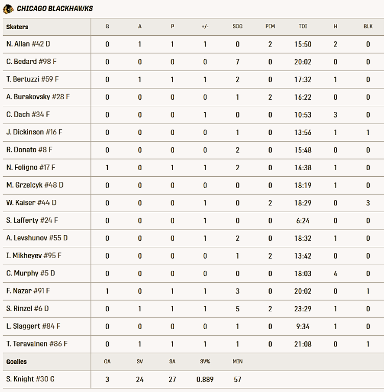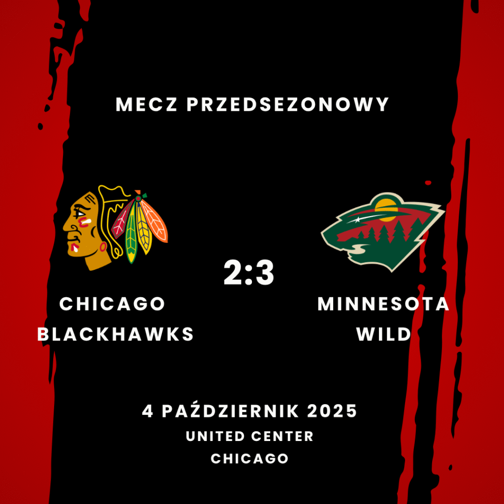 W meczu rozegranym minionej nocy w United Center, Chicago Blackhawks przegrali z Minnesota Wild 2:3 (2:0, 0:3, 0:0). Bramki dla gospodarzy strzelili Franka Nazar (Tyler Bertuzzi, Teuvo Teravainen) oraz Nick Foligno (Sam Rinzel, Nolan Allan). Bramki dla gości strzelili: Vladimir Tarasenko (Matt Boldy, Zeev Buium – w przewadze), Joel Eriksson Ek (Matt Boldy, Zeev Buium – w przewadze) oraz Ryan Hartman (Kirill Kaprizov, Marco Rossi – w przewadze).
