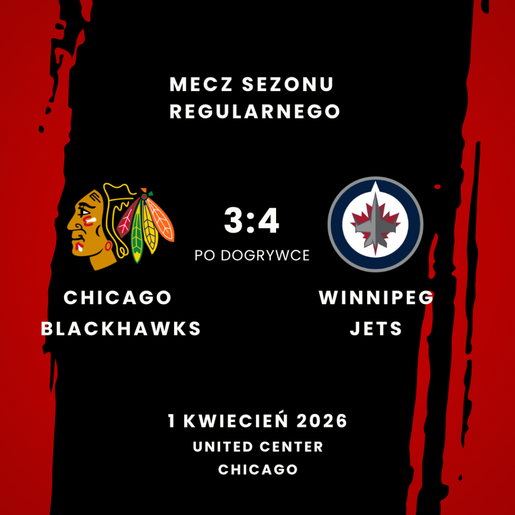 W meczu rozegranym ubiegłej nocy w United Center, Chicago Blackhawks przegrali po dogrywce z Winnipeg Jets 3:4 (1:0, 1:3, 1:0, 0:1). Bramki dla gospodarzy strzelili: Anton Frondell (Ilya Mikheyev, Louis Crevier), Tyler Bertuzzi (bez asysty) oraz ponownie Tyler Bertuzzi (Ilya Mikheyev, Louis Crevier). Bramki dla gości strzelili: Josh Morrissey (Kyle Connor, Mark Scheifele), Cole Perfetti (Alex Iafallo, Mark Scheifele – w przewadze), Isak Rosen (Danil Zhilkin, Neal Pionk) i Kyle Connor (Mark Scheifele, Josh Morrissey).