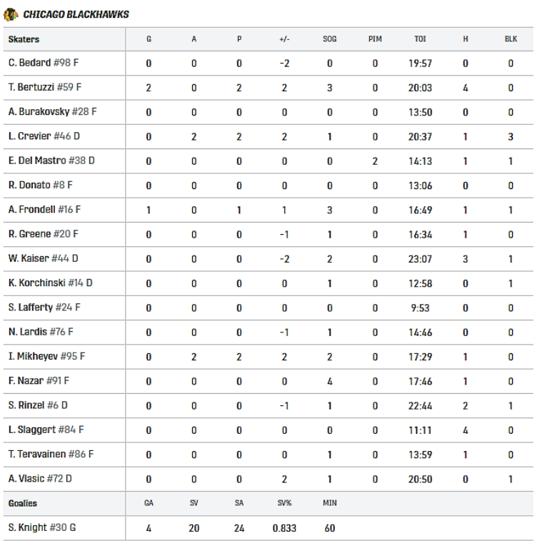 Bertuzzi zdobył swojego drugiego gola w połowie trzeciej tercji, wyrównując wynik 31 golem w sezonie, ustanawiając nowy rekord kariery. Przy tej akcji Crevier, Mikheyev i Bertuzzi zdobyli swoje drugie punkty w meczu, pomagając Blackhawks wyrównać stan meczu na 3:3.