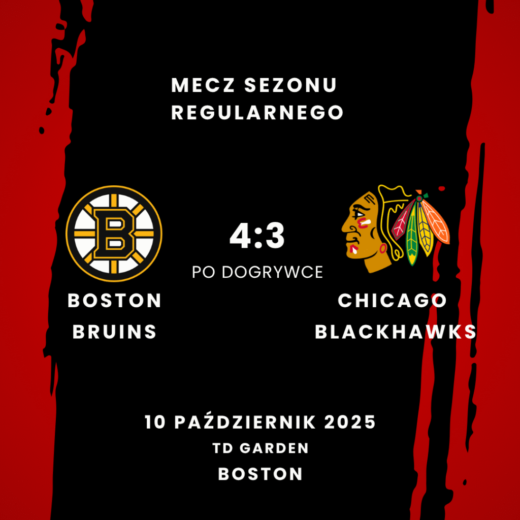 W meczu rozegranym minionej nocy w TD Garden, Chicago Blackhawks przegrali po dogrywce z Boston Bruins 3:4 (1:1, 1:1, 1:1, 0:1). Bramki dla gospodarzy strzelili: Casey Mittelstadt (bez asysty), Tanner Jeannot (Michael Eyssimont, Henri Jokiharju), Elias Lindholm (Pavel Zacha, David Pastrnak – w przewadze) oraz Fraser Minten (bez asysty). Bramki dla gości strzelili: Connor Bedard (Andre Burakovsky, Colton Dach), Louis Crevier (Connor Bedard, Nick Foligno) oraz Andre Burakovsky (Artyom Levshunov, Frank Nazar).