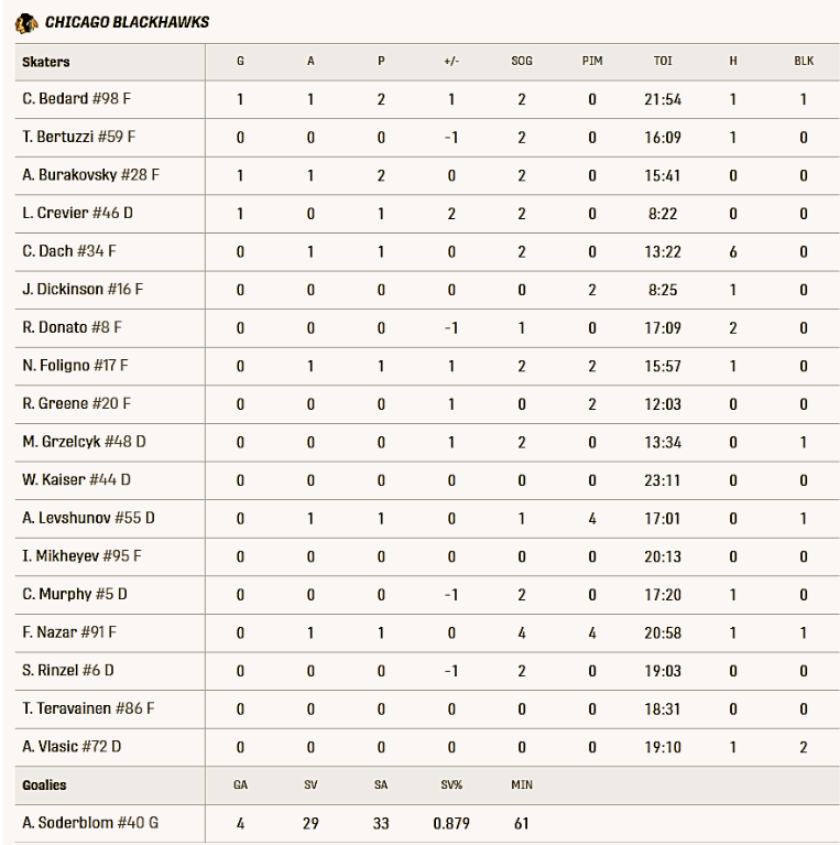 Na początku drugiej tercji Bedard zaliczył asystę pierwszego stopnia przy golu Louisa Creviera, który dał Blackhawks prowadzenie 2:1. Kapitan Nick Foligno zasługuje na uznanie za wygrane wznowienie w ofensywnej tercji, które rozpoczęło akcję.