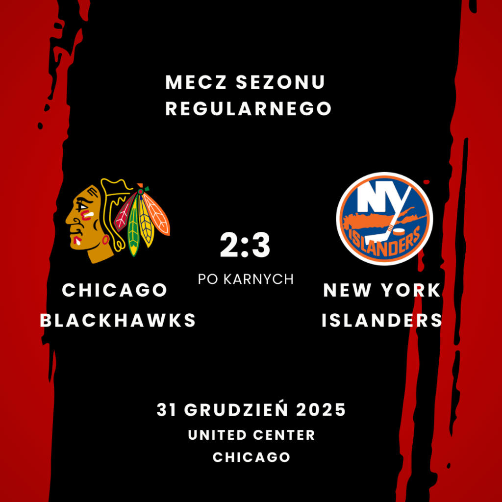 W meczu rozegranym dzisiejszej nocy w United Center, Chicago Blackhawks przegrali po karnych z New York Islanders 2:3 (0:2, 2:0, 0:0, 0:0, 0:1). Bramki dla gospodarzy strzelili: Teuvo Teravainen (Oliver Moore, Artyom Levshunov) oraz Nick Lardis (Oliver Moore, Ryan Greene – w przewadze). Bramki dla gości strzelili: Calum Ritchie (Simon Holmstrom, Max Shabanov) oraz Bo Horvat (Mathew Barzal, Matthew Schaefer – w przewadze). Jedynego karnego w serii najazdów, strzelił dla Islanders Bo Horvat.