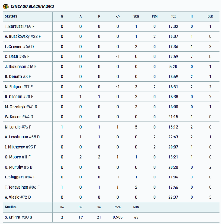 Skład Blackhawks i statystyki zawodników w meczu z Islanders