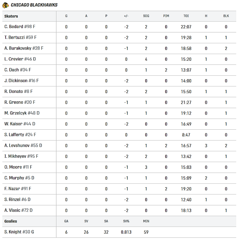 To był jeden z niewielu występów Blackhawks w tym roku, o którym należałoby jak najszybciej zapomnieć. Zespół z Wietrznego Miasta przegrał wcześniej więcej niż dwiema bramkami tylko dwa razy. Connor Bedard miał rzadko zdarzającą się słabszą noc, z ratingiem minus dwa i tylko dwoma strzałami na bramkę w ponad 22 minutach swojego czasu gry. Tyler Bertuzzi miał nietypowo słaby występ, z kilkoma złymi podaniami krążka, będąc na lodzie przy dwóch golach przeciwnika. Zarówno Sam Rinzel, jak i Artyom Levshunov również zaliczyli kilka niespodziewanych błędów w strefie defensywnej.