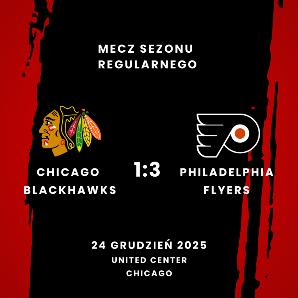 W swoim ostatnim meczu przed przerwą świąteczną, Chicago Blackhawks nie zdołali przerwać fatalnej serii porażek, przegrywając 1:3 z Philadelphia Flyers w United Center. To już szósta z rzędu porażka Blackhawks, a zespół pozostaje bez zwycięstwa od momentu kontuzji Connora Bedarda, która miała miejsce 12 grudnia. W dzisiejszym spotkaniu Blackhawks ponownie musieli radzić sobie bez Bedarda, a dodatkowo był to pierwszy mecz bez Franka Nazara, który w sobotniej porażce z Ottawa Senators dostał krążkiem w twarz. Nazar ma pauzować około miesiąca z powodu urazu twarzy, co oznacza, że Chicago na dłuższy czas zostało pozbawione dwóch najlepszych środkowych. Zgodnie z przewidywaniami, bez Bedarda i Nazara, Blackhawks mieli ogromne problemy z kreowaniem groźnych sytuacji strzeleckich przeciwko solidnej defensywie Flyers.