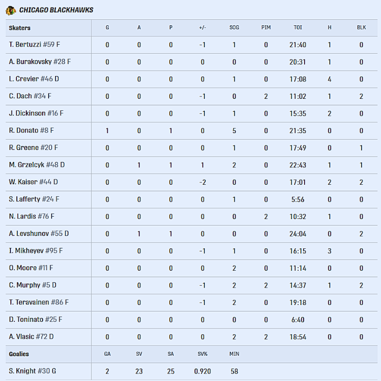 W meczu rozegranym dzisiejszej nocy w United Center, Chicago Blackhawks przegrali z Philadelphia Flyers 1:3 (0:1, 1:1, 0:1). Jedyną bramkę dla gospodarzy strzelił Ryan Donato (Matthew Grzelcyk, Artyom Levshunov). Bramki dla gości strzelili: Travis Konecny (Trevor Zegras, Sean Couturier), Noah Cates (Travis Konecny, Jamie Drysdale – w przewadze) oraz