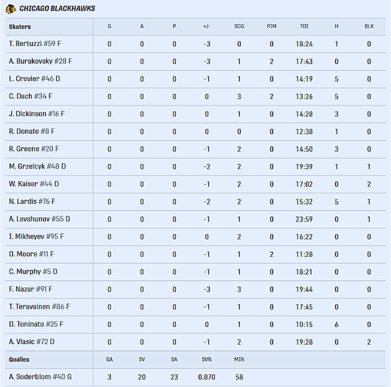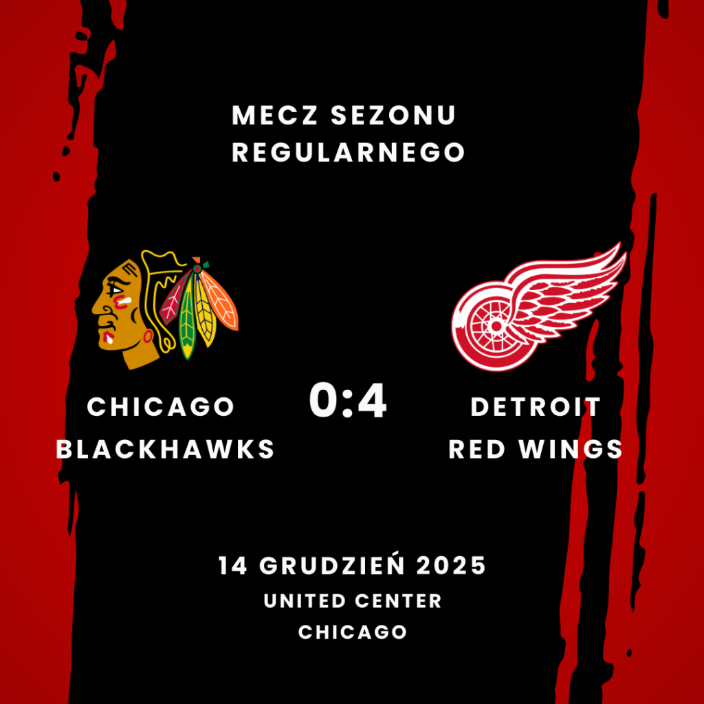 W meczu rozegranym minionej nocy w United Center, Chicago Blackhawks przegrali z Detroit Red Wings 0:4 (0:2, 0:1, 0:1). Bramki dla gości strzelili: Alex DeBrincat (Andrew Copp, Patrick Kane), Patrick Kane (Alex DeBrincat), Emmitt Finnie (Lucas Raymond, Axel Sandin-Pellikka) oraz ponownie Alex DeBrincat (bez asysty – do pustej bramki).