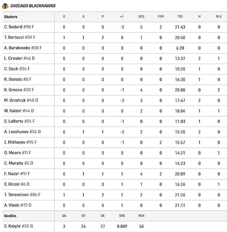 CHI — Teuvo Teravainen (1), Frank Nazar (1), Tyler Bertuzzi (1), Artyom Levshunov (1)