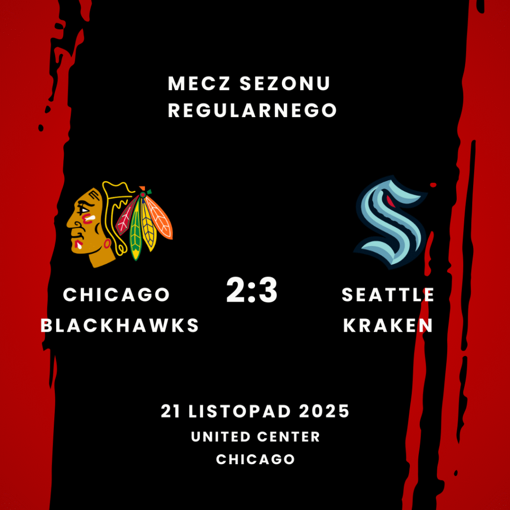 W meczu rozegranym dzisiejszej nocy w United Center, Chicago Blackhawks przegrali z Seattle Kraken 2:3 (0:0, 2:0, 0:3). Bramki dla gospodarzy strzelili: Tyler Bertuzzi (Teuvo Teravainen, Frank Nazar) oraz Teuvo Teravainen (Tyler Bertuzzi, Artyom Levshunov – w przewadze). Bramki dla gości strzelili: Tye Kartye (Oscar Fisker Molgaard, Brandon Montour), Shane Wright (Ryker Evans, Berkly Catton) oraz Jaden Schwartz (Brandon Montour, Mason Marchment – w przewadze).