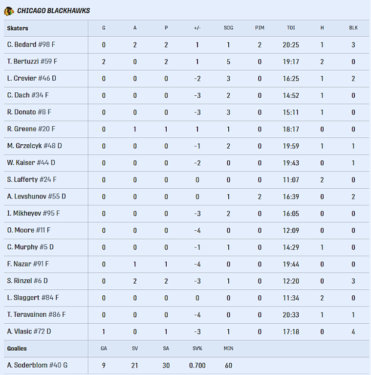 Blackhawks zostali dobici przez Jacoba Brysona, który zdobył dziewiątego i ostatniego gola dla gospodarzy na niespełna cztery minuty przed końcem meczu. Moore, Nazar i Teravainen znowu byli na lodzie podczas tego trafienia i niestety cała trójka zakończyła mecz z bilansem minus cztery w klasyfikacji plus/minus.