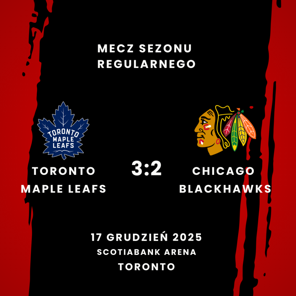 W meczu rozegranym minionej nocy w Scotiabank Arena, Chicago Blackhawks przegrali z Toronto Maple Leafs 2:3 (2:0, 0:0, 0:3). Bramki dla gospodarzy strzelili: Oliver Ekman-Larsson (Auston Matthews, William Nylander), Auston Matthews (William Nylander – w przewadze) oraz Dakota Joshua (Troy Stecher, Jake McCabe). Bramki dla gości strzelili: Wyatt Kaiser (Dominic Toninato) oraz Jason Dickinson (Ilya Mikheyev, Louis Crevier – w osłabieniu).