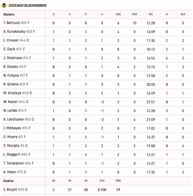 Skład Blackhawks i statystyki zawodników w meczu z Blues