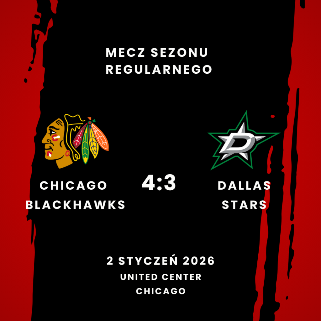 W meczu rozegranym dzisiejszej nocy w United Center, Chicago Blackhawks wygrali z Dallas Stars 4:3 (1:1, 2:0, 1:2). Bramki dla gospodarzy strzelili: Artyom Levshunov (Andre Burakovsky, Ryan Donato – w przewadze), Teuvo Teravainen (Andre Burakovsky, Tyler Bertuzzi – w przewadze), Ilya Mikheyev (Matt Grzelcyk) oraz ponownie Ilya Mikheyev (Ryan Donato, Connor Murphy). Bramki dla gości strzelili: Mikko Rantanen (Sam Steel), Jason Robertson (Mikko Rantanen, Matt Duchene) oraz Matt Duchene (Wyatt Johnston, Jason Robertson).