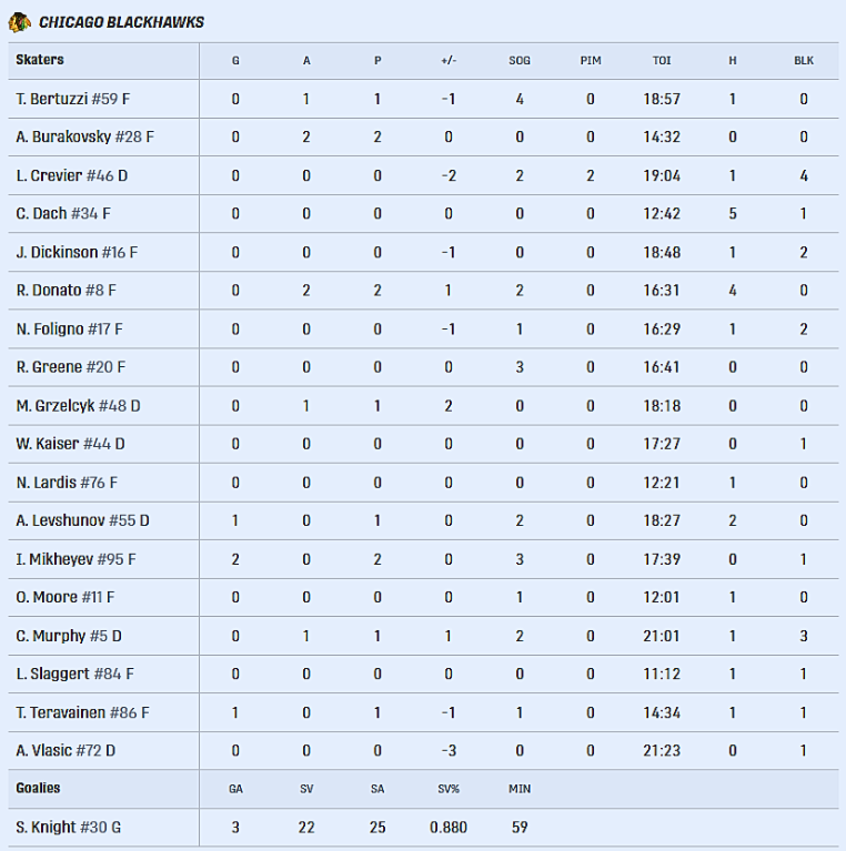 Skład Blackhawks i statystyki zawodników w meczu ze Stars