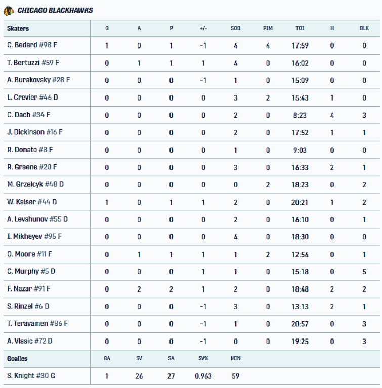 W końcu Blackhawks wywalczyli swoją pierwszą okazję w power play około 14 minuty środkowej tercji meczu. Nie zajęło to długo, zanim najlepsza jednostka zamieniła przewagę na gola, gdy Bedard i Tyler Bertuzzi szybko przeprowadzili perfekcyjną wymianę podań, dając gościom prowadzenie 1:0. Bedard wepchnął podanie Bertuzziego do bramki, zdobywając swoją 18 bramkę w sezonie, a także przedłużając swoją wyjazdową serię punktową do dziewięciu meczów. Nazar przedłużył swoją serię punktową do czterech meczów dzięki asyście drugiego stopnia.