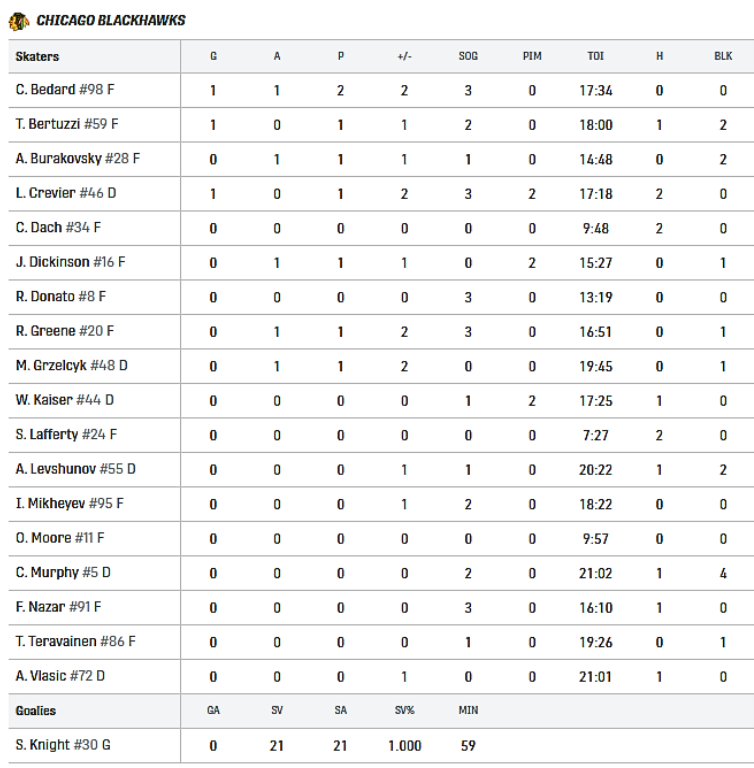 W meczu rozegranym minionej nocy w United Center, Chicago Blackhawks wygrali z New York Rangers 3:0 (0:0, 2:0, 1:0). Bramki dla gospodarzy strzelili: Louis Crevier (Matt Grzelcyk, Jason Dickinson – w osłabieniu), Connor Bedard (Andre Burakovsky) oraz Tyler Bertuzzi (Ryan Greene, Connor Bedard).