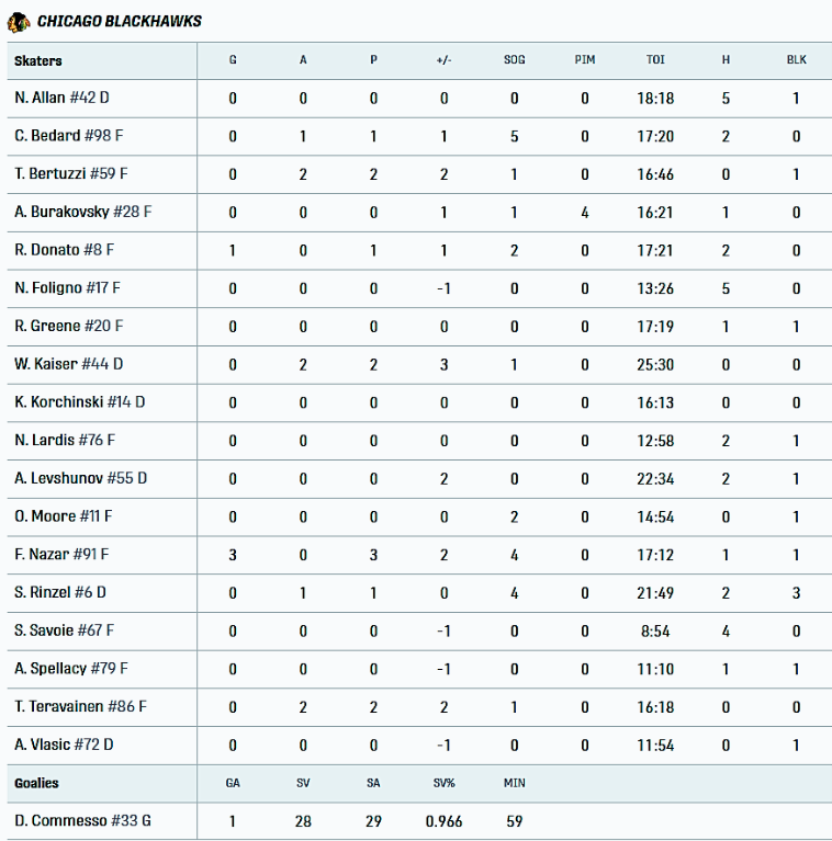 Frank Nazar poprowadził kolegów z drużyny, notując rewelacyjny występ, zaliczając pierwszego hat-tricka podczas preseason NHL. Do siatki trafił również Ryan Donato, a Connor Bedard zaliczył asystę przy tym trafieniu, którą trzeba zobaczyć. Teuvo Teravainen, Tyler Bertuzzi i Wyatt Kaiser zanotowali mecz wielopunktowy, a Drew Commesso obronił 28 z 29 strzałów w swoim debiucie w okresie przedsezonowym.