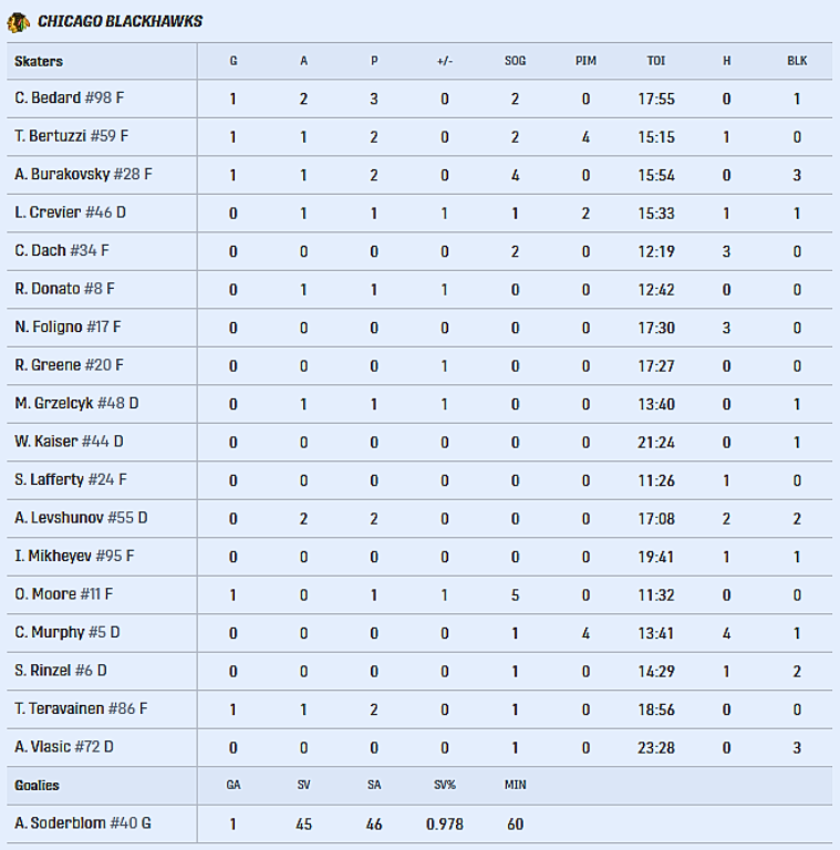 CHI — Connor Bedard (2), Teuvo Teräväinen (1), Tyler Bertuzzi (1), Andre Burakovsky (1), Artyom Levshunov (2)